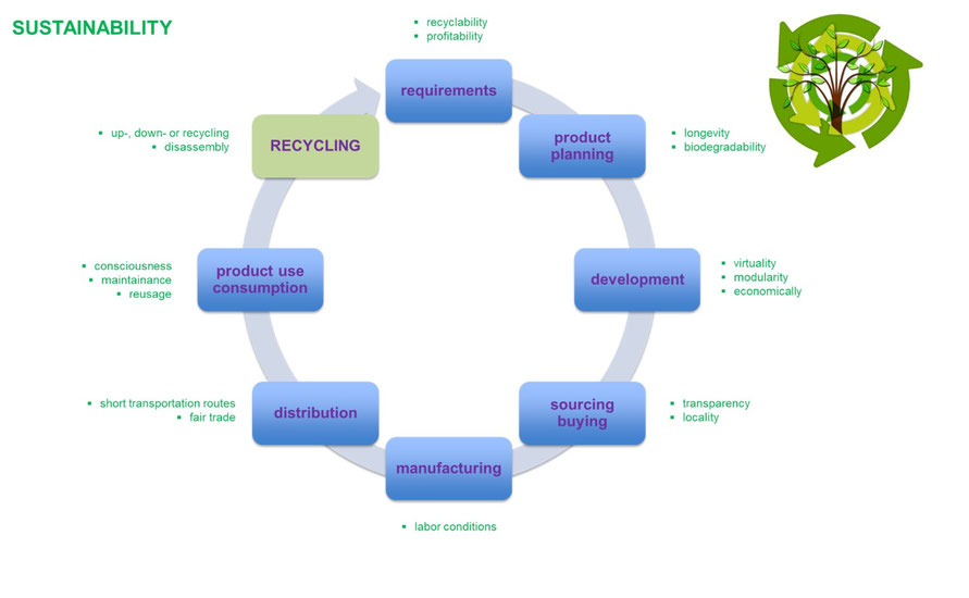 One of the major issues concerning sustainability is circularity – Circular Fashion is one of the Buzz-Topics related to the Clothing Product Lifecycle. Therefore, the first Challenge would be turning the product life cycle into a product life circle. If we do so – the biggest challenge is the recycling part. To be able to really recycle clothing products, we have to put recyclability into our requirements and actually generate product ideas from that. But we still have to consider that our company has to survive and that means that we have to generate some kind of profitability to be able to attract shareholders.